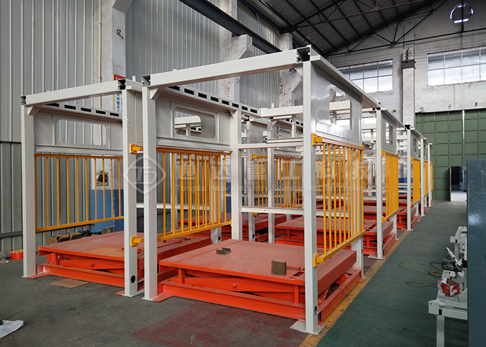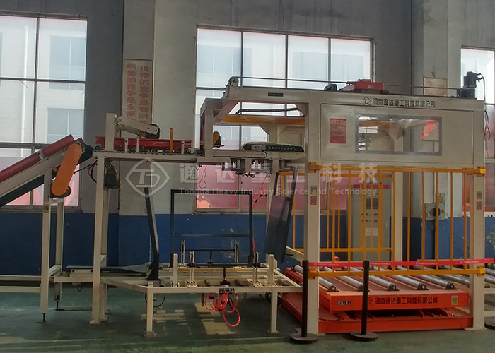 高位機(jī)械手碼垛機(jī)的工作原理是平板上工件符合棧板要求的一層工件,平板及工件向前移動(dòng)直至棧板垂直面。上方擋料桿下降,另三方定位擋桿起動(dòng)夾緊,此時(shí)平板復(fù)位。各工件下降到棧板平面,棧板平面與平板底面相距10mm,棧板下降一個(gè)工件高度。往復(fù)上述直到棧板堆碼達(dá)到設(shè)定要求。